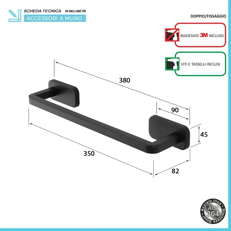 La barra portasciugamani proposta viene installato direttamente a parete,sfruttando una doppia modalità di fissaggio:biadesivo 3M o viti e tasselli,entrambi inclusi nella confezione.