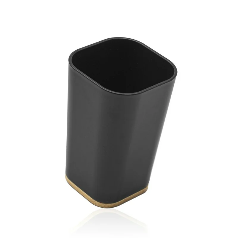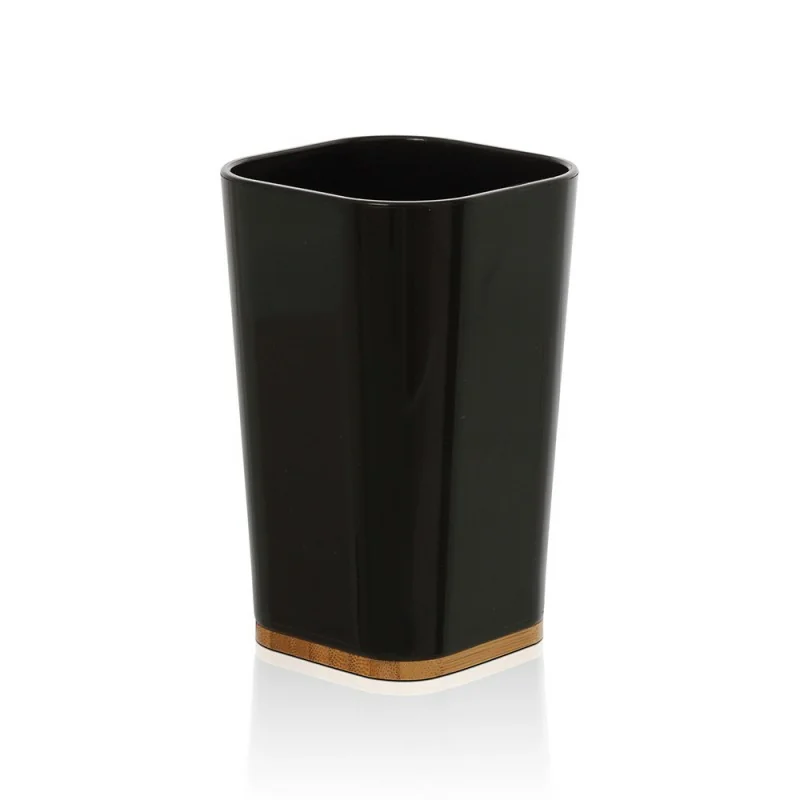 Porta spazzolini in finitura nera opaca con dettagli in bamboo Porta spazzolino in finitura nera opaca con dettagli in legno di bambù Scheda tecnica porta spazzolini in finitura nera opaca con dettagli in bamboo Bicchiere per spazzolini in finitura nera opaca con dettagli in bamboo Set completo accessori bagno da appoggio con dettagli in bambù