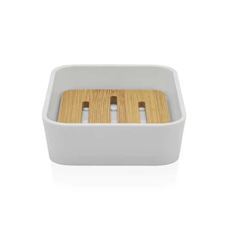 Portasaponetta da appoggio in finitura bianco opaco con inserti in bambù