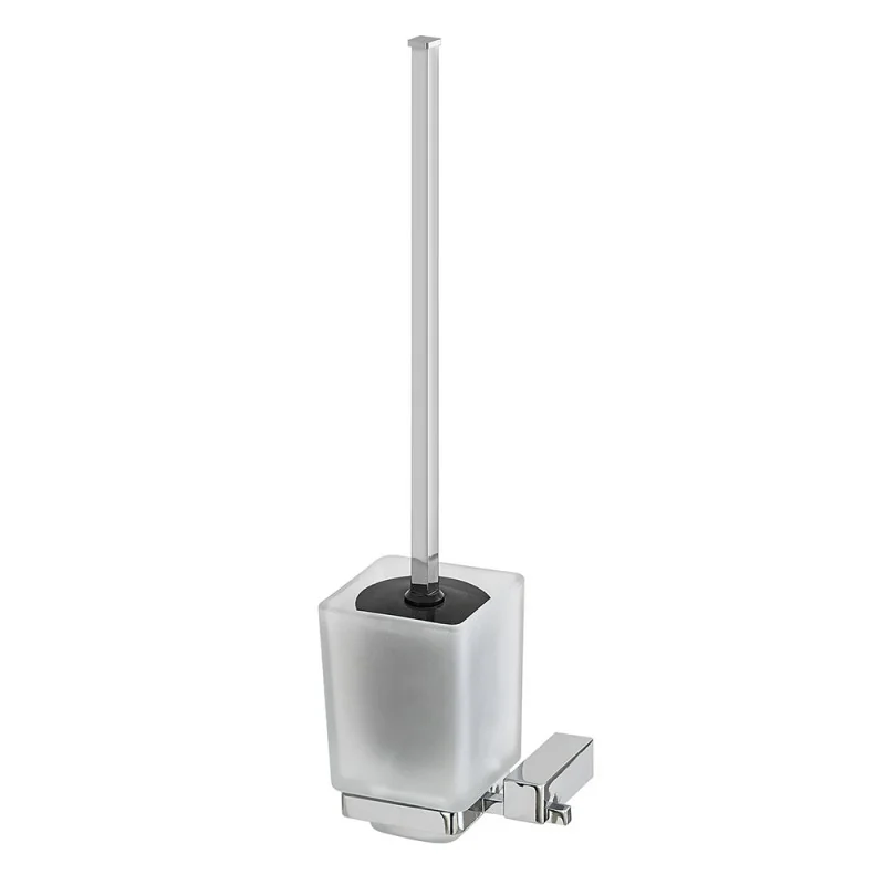 Portascopino da parete con contenitore in vetro satinato, spazzola in setole nere e supporto in acciaio cromato