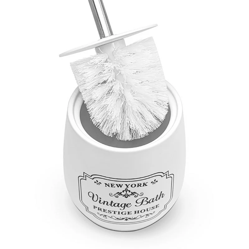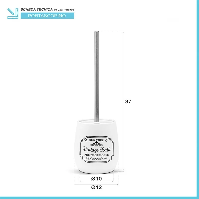 Porta scopino bagno in ceramica bianca con stampe a contrasto nere vintage Portascopino wc in ceramica bianca con stampe a contrasto nere vintage Scheda tecnica porta scopino bagno in ceramica bianca con stampe a contrasto nere vintage Porta scopino bagno in ceramica bianca con scopettino wc con manico in acciaio cromato Porta scopino bagno in ceramica bianca con spazzolone wc con setole bianche morbide