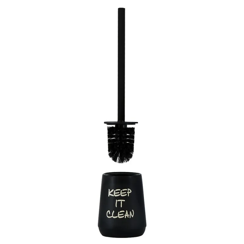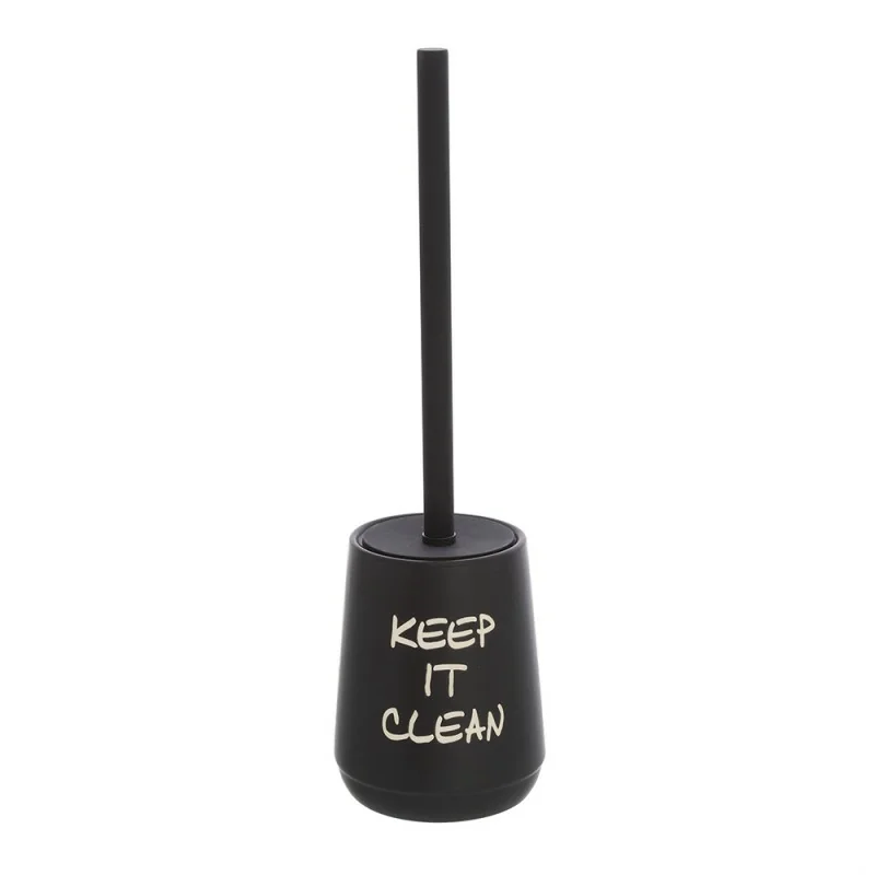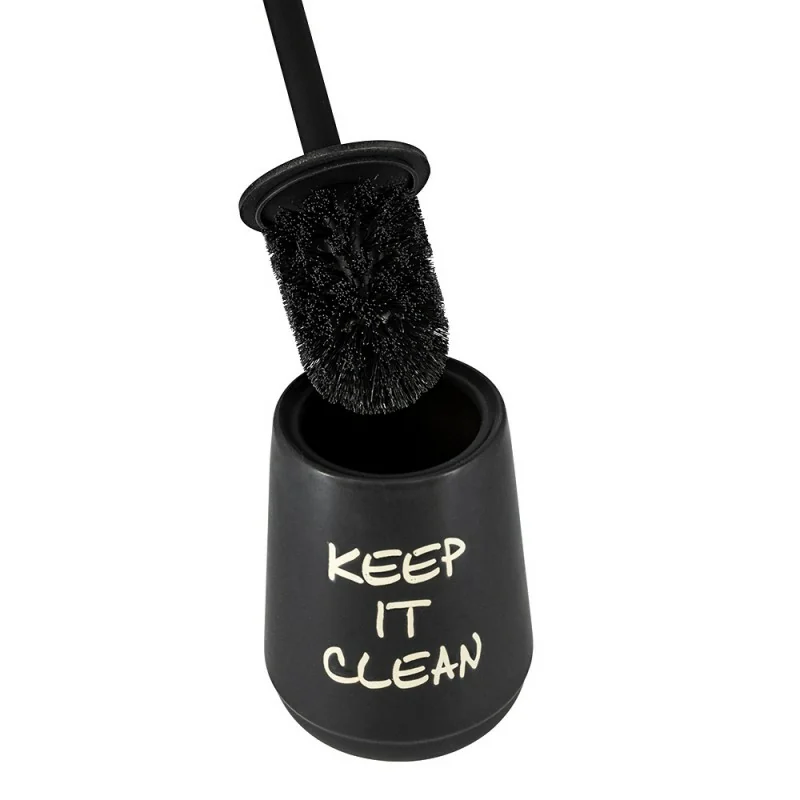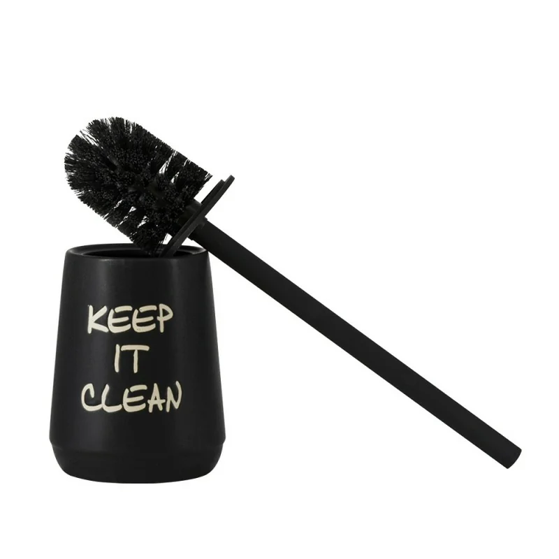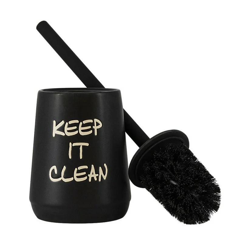 La ceramica è il materiale ideale per completare l'ambiente bagno con accessori di qualità,semplici da pulire e durevoli nel tempo. Il porta scopino da appoggio in colore nero ha una scritta stampata dal gusto vintage a contrasto,in colore beige. Le setole sono lunghe,per garantire una maggiore pulizia.