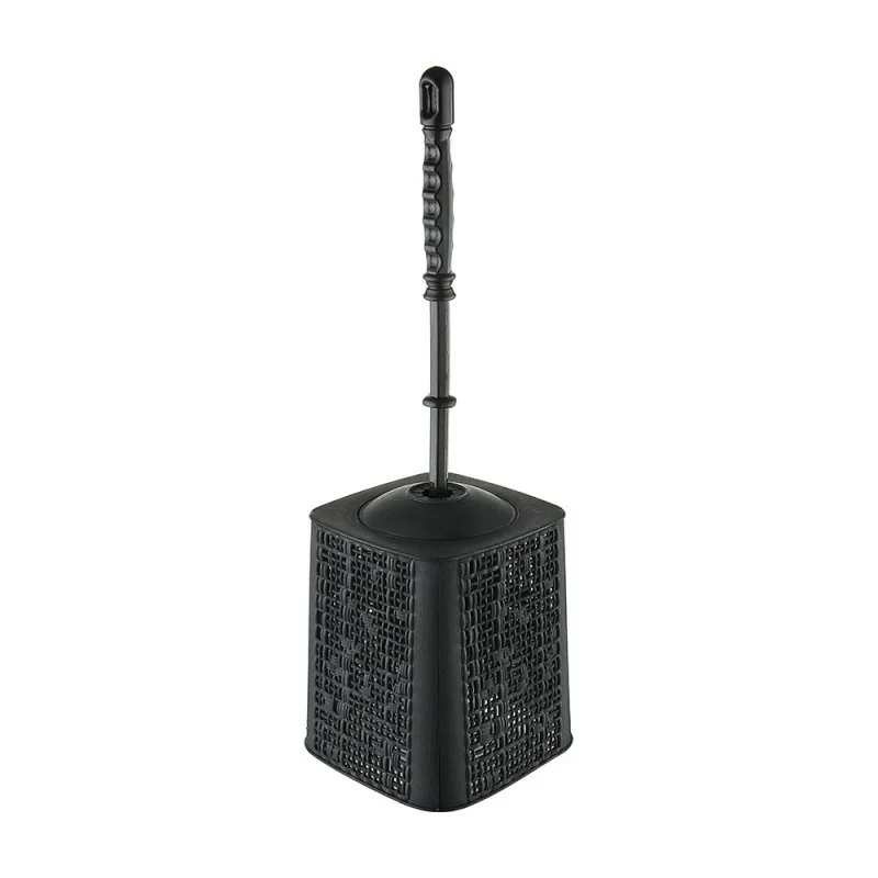 Porta scopino in plastica nera con motivi a intreccio dal manico ergonomico e setole nere