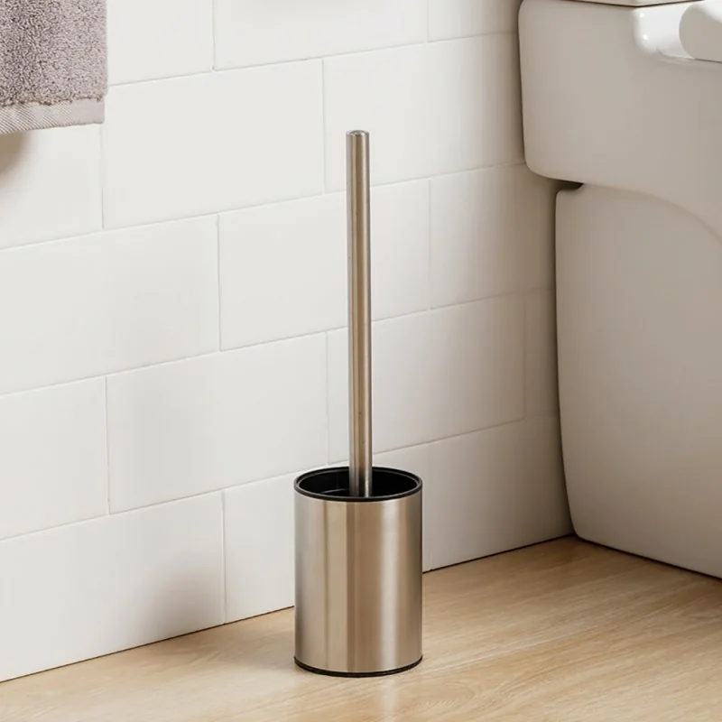 Porta scopino bagno in acciaio inox satinato e spazzolino con setole nere