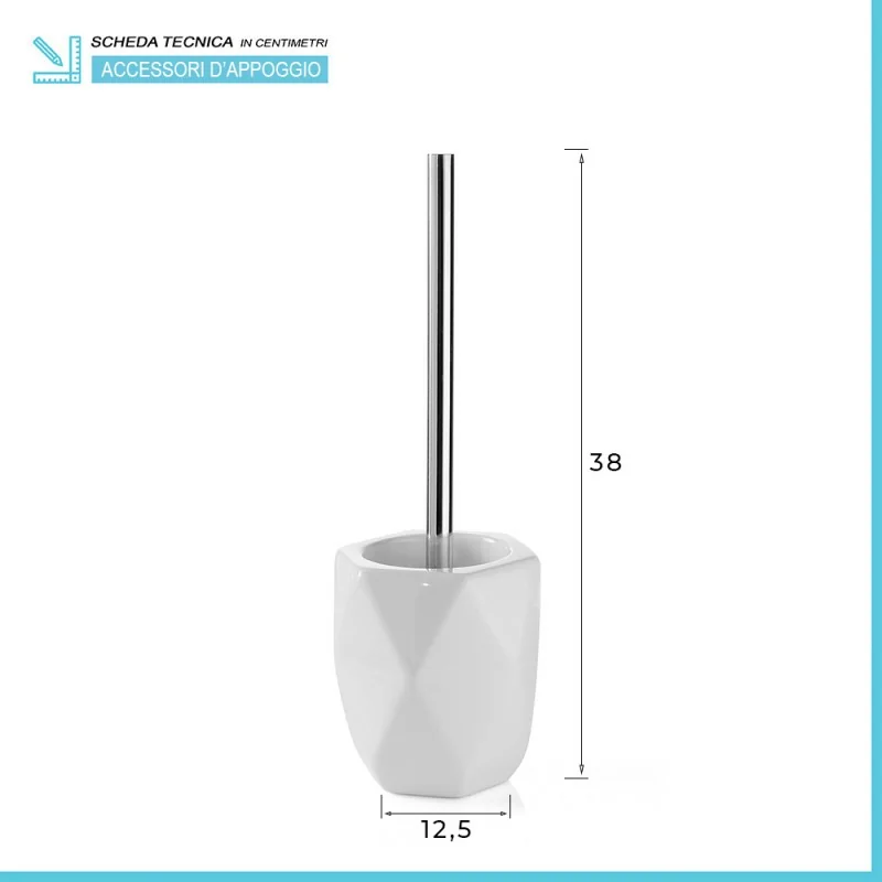 Il Portascopino wc Gedy serie Dalia arricchisce il tuo bagno con gusto contemporaneo,il porta spazzola è realizzato in ceramica di colore bianco e lo scopino ha il manico in acciaio inox con ciuffo in setole. La gamma di accessori bagno da appoggio Dalia può essere completata con tutti gli altri elementi:portasapone,dispenser sapone e portaspazzolini