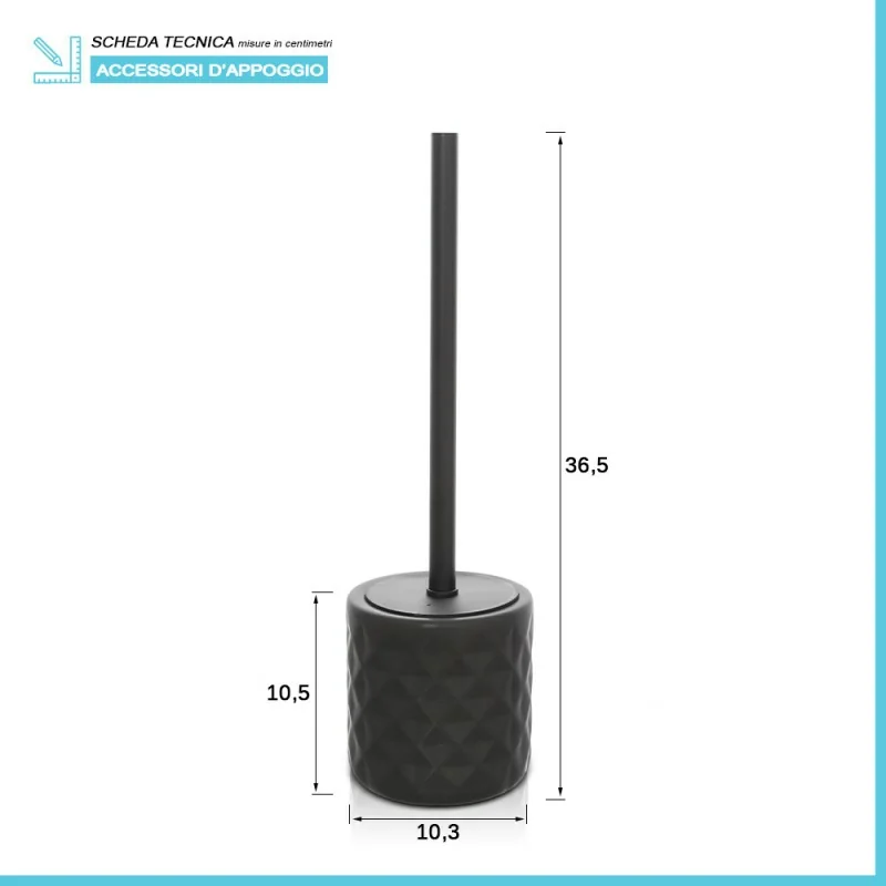 Lo scopino per wc è un complemento ideato per massimizzare la cura dell’igiene del vaso:è dotato,infatti,di un paraspruzzi in morbido silicone per far arrivare il ciuffo in ogni angolo del sanitario. Il manico è realizzato in abs con finitura nera.