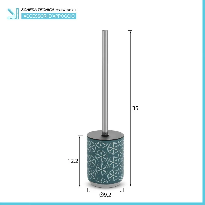 Ciascun prodotto è realizzato in ceramica di alta qualità,in grado di garantire al prodotto resistenza nel tempo. Il portascopino è turchese cobalto,composto dal bicchiere in ceramica e lo scopino con manico cromo in ABS e setole nere,ideali per garantire una costante igiene.