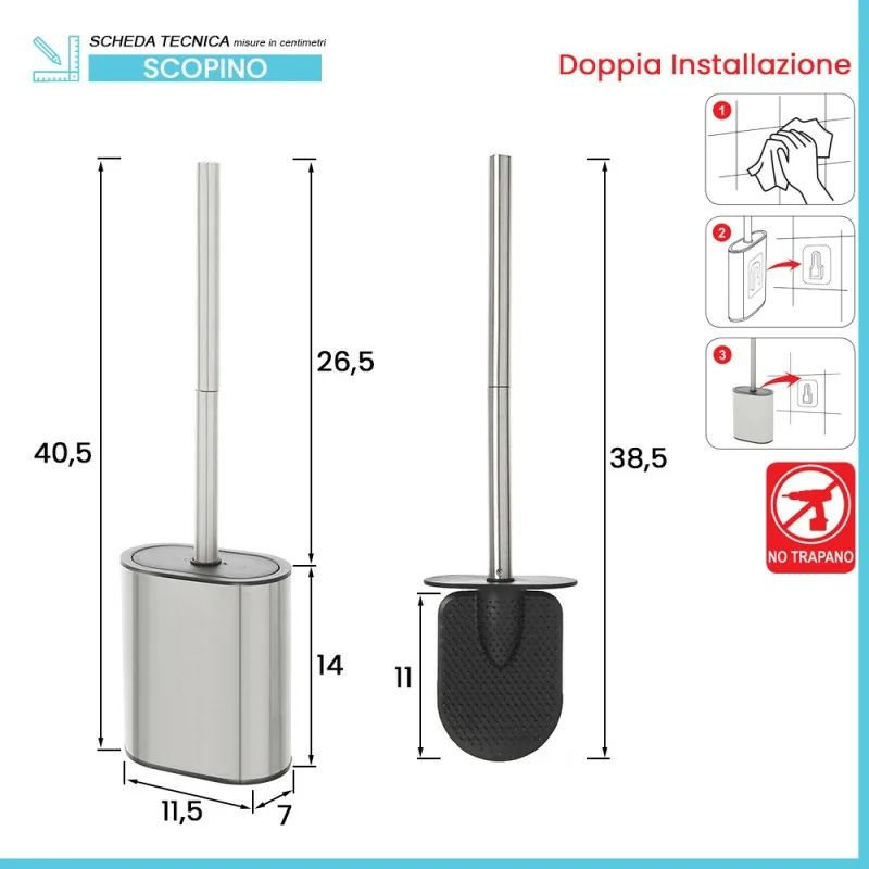Il portascopino salvaspazio è dotato di doppia installazione,in appoggio al pavimento o a parete con adesivo incluso,senza alcuna perforazione richiesta. L’impiego del materiale siliconico garantisce una durata maggiore,senza deformarsi ne lasciare cattivi odori.