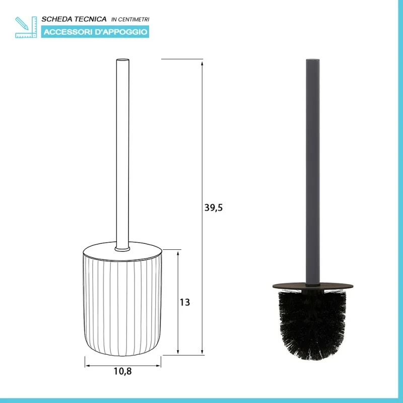 Lo scopino wc da bagno ha installazione direttamente in appoggio al pavimento e dispone di comode setole nere anti-igieniche, riparate da un paraspruzzi che consente di evitare schizzi d’acqua.