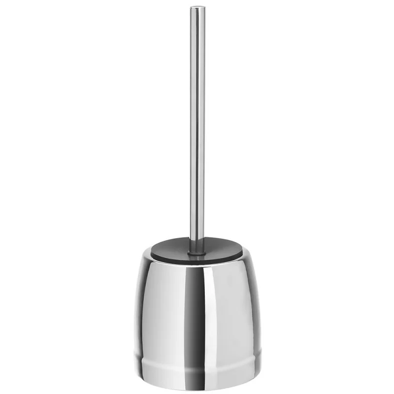 Questo porta scopino da appoggio riprende la forma cilindrica leggermente svasata e la finitura cromata lucida distintiva della linea Krom. La base in ceramica cromata offre stabilità, mentre l'inserto superiore nero accoglie lo scopino. L'insieme crea un accessorio funzionale e dal design moderno, perfetto per completare un bagno dallo stile ricercato e luminoso.