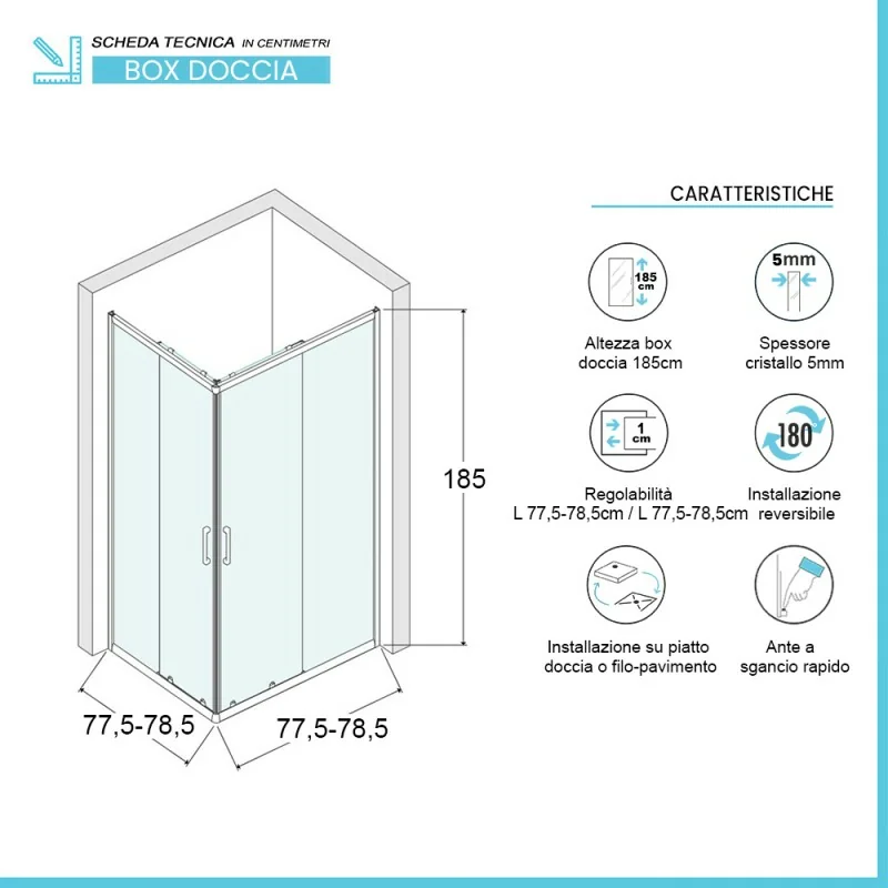 Box Doccia Angolare 80x80 cm in Cristallo Temperato Trasparente