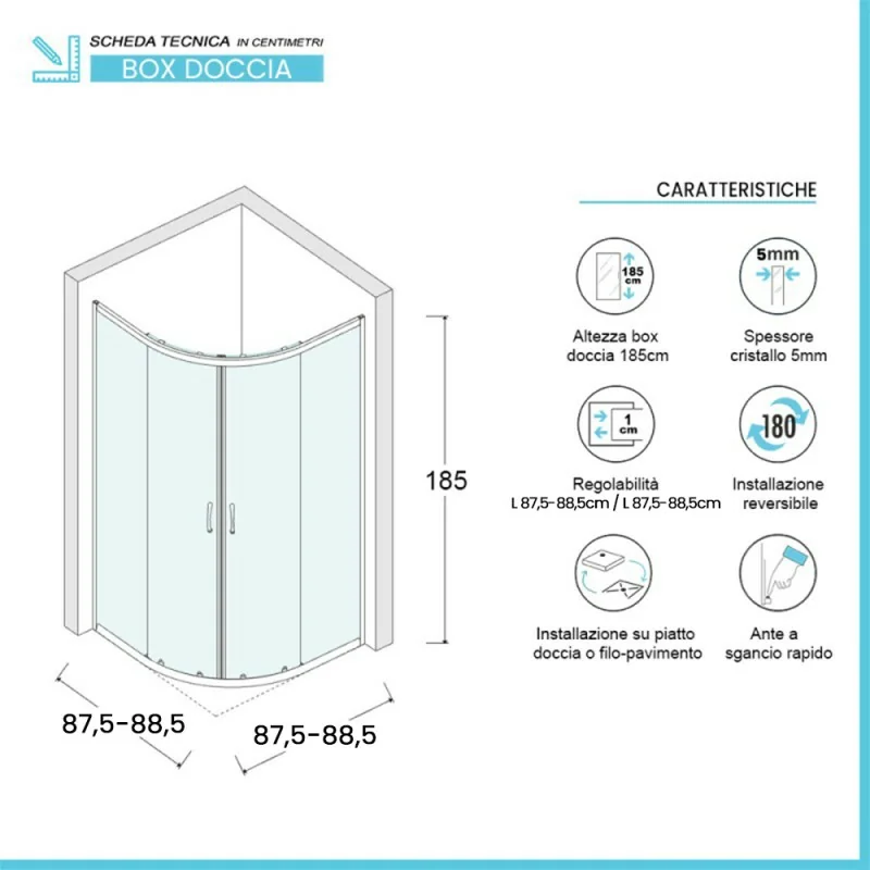 Cabina doccia semicircolare reversibile con vetro 5 mm,chiusura magnetica e sgancio rapido