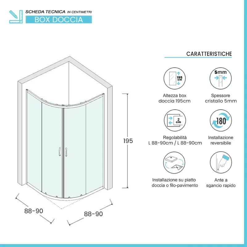 Box doccia semicircolare 90x90 cm cromo scorrevole in cristallo trasparente Tay Scheda tecnica Box doccia semicircolare 90x90 cm cromo scorrevole in cristallo trasparente Tay Maniglie Box doccia semicircolare 90x90 cm cromo scorrevole in cristallo trasparente Tay Profili Box doccia semicircolare 90x90 cm cromo scorrevole in cristallo trasparente Tay Dettagli Box doccia semicircolare 90x90 cm cromo scorrevole in cristallo trasparente Tay Ante Box doccia semicircolare 90x90 cm cromo scorrevole in cristallo trasparente Tay Sgancio rapido Box doccia semicircolare 90x90 cm cromo scorrevole in cristallo trasparente Tay