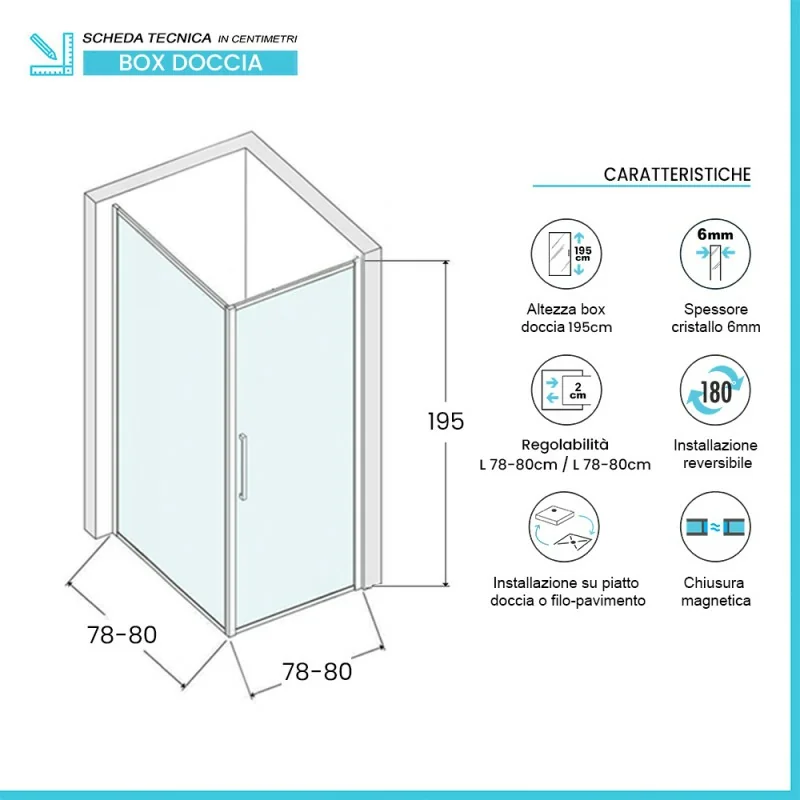 Box doccia angolare 80x80 – caratteristiche tecniche: