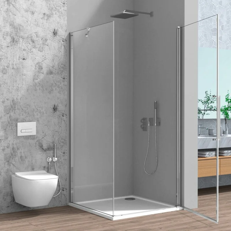 Cabina doccia angolare con porta battente e lato fisso in vetro temperato trasparente 80x80 profili cromo Linea Neos