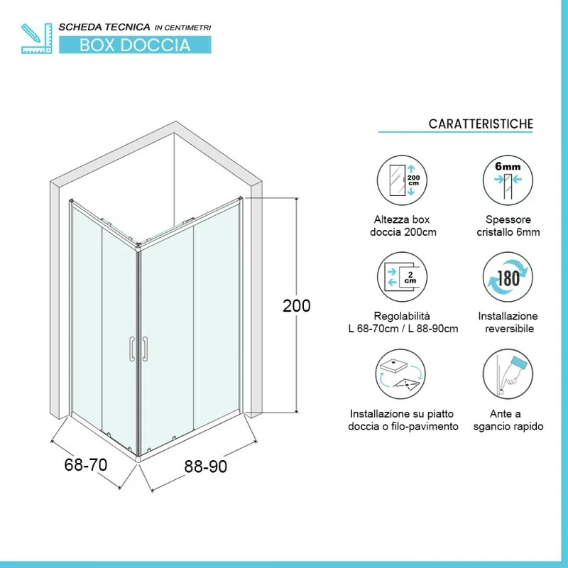 Cabina doccia angolare reversibile con vetro 6 mm,chiusura magnetica e sgancio rapido