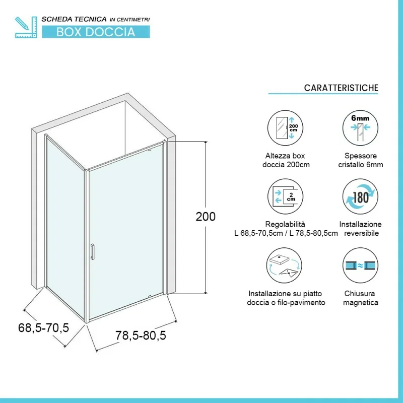 Cabina doccia angolare reversibile con vetro 6 mm,installazione reversibile e chiusura magnetica