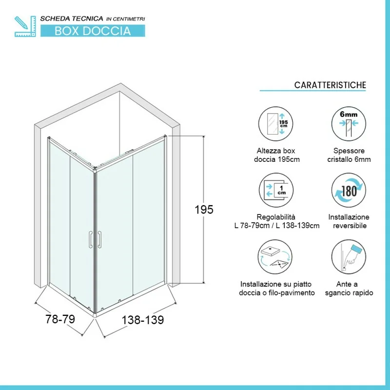 Il box doccia Icon è una cabina doppio scorrevole angolare con chiusura magnetica e sgancio rapido;dispone di installazione reversibile e tolleranza di regolazione pari a 1 cm,ideale per ottimizzare eventuali pareti fuori squadro. L’apertura scorrevole delle porte è accompagnata da pratica maniglia dentro-fuori cromata lucida.