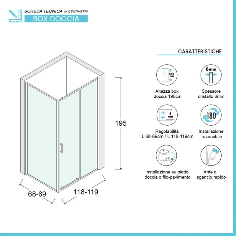 Profili in alluminio cromato del box doccia 70x120 serie Icon Cabina doccia 70x120 cm serie Icon con maniglia in abs cromato Box per doccia 70x120 cm serie Icon con ante a sgancio rapido e chiusura magnetica Vano doccia 70x120 cm serie Icon in vetro temperato