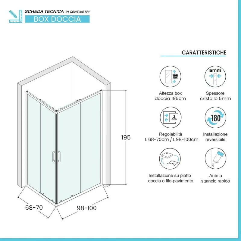 Box doccia angolare – H 195 cm,ante scorrevoli 5mm con profilo cromato lucido e installazione reversibile