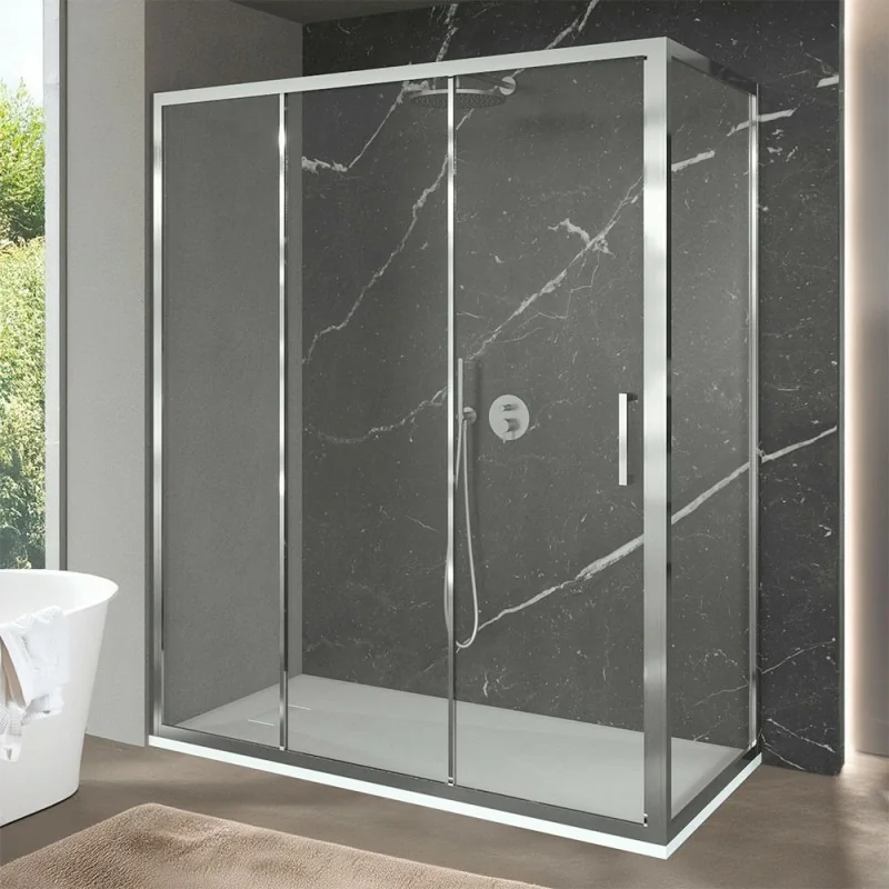 Cabina doccia angolare con vetro 6 mm,porta scorrevole a 3 ante con chiusura magnetica e sgancio rapido