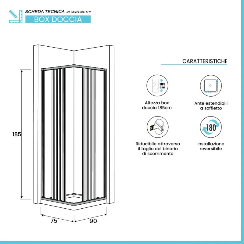 Cabina doccia angolare 75x90 e H185cm reversibile con apertura centrale a soffietto in PVC Linea Teti