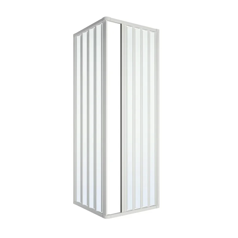 Il Box doccia angolare della Linea Teti, con pannelli semitrasparenti e profili bianchi, è realizzato in PVC e presenta due ante estensibili a soffietto con apertura centrale e chiusura calamitata a tutta altezza. I pannelli, con maniglia integrata nel profilo della porta, si raggruppano sui due lati del box garantendo un ampio spazio d’entrata. La cabina doccia Teti è la soluzione ideale per piatti doccia incassati tra due pareti ad angolo.