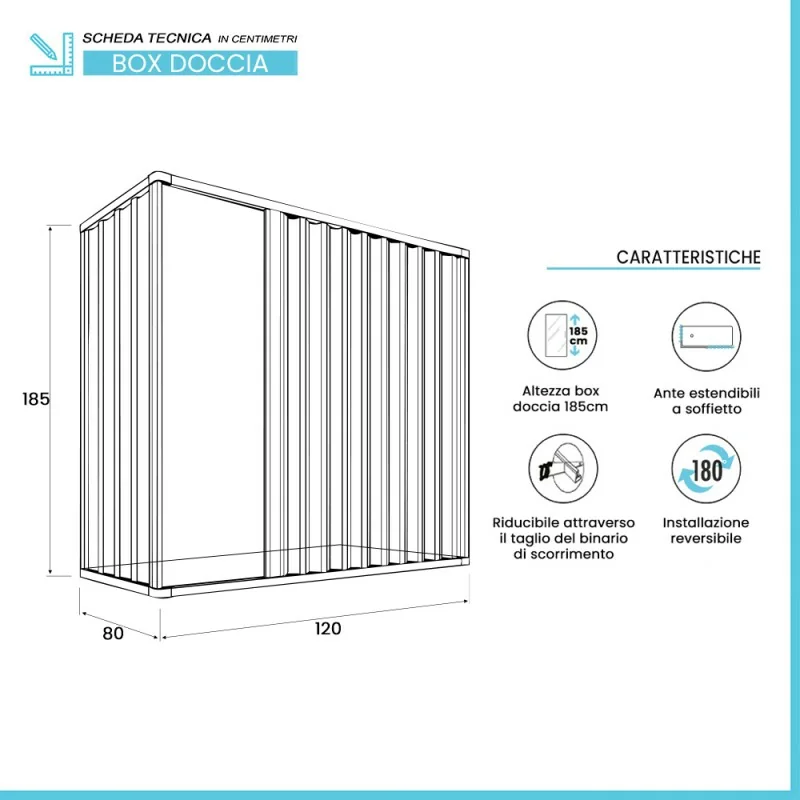 Cabina doccia angolare 80x120 e H185cm reversibile con apertura centrale a soffietto in PVC Linea Teti