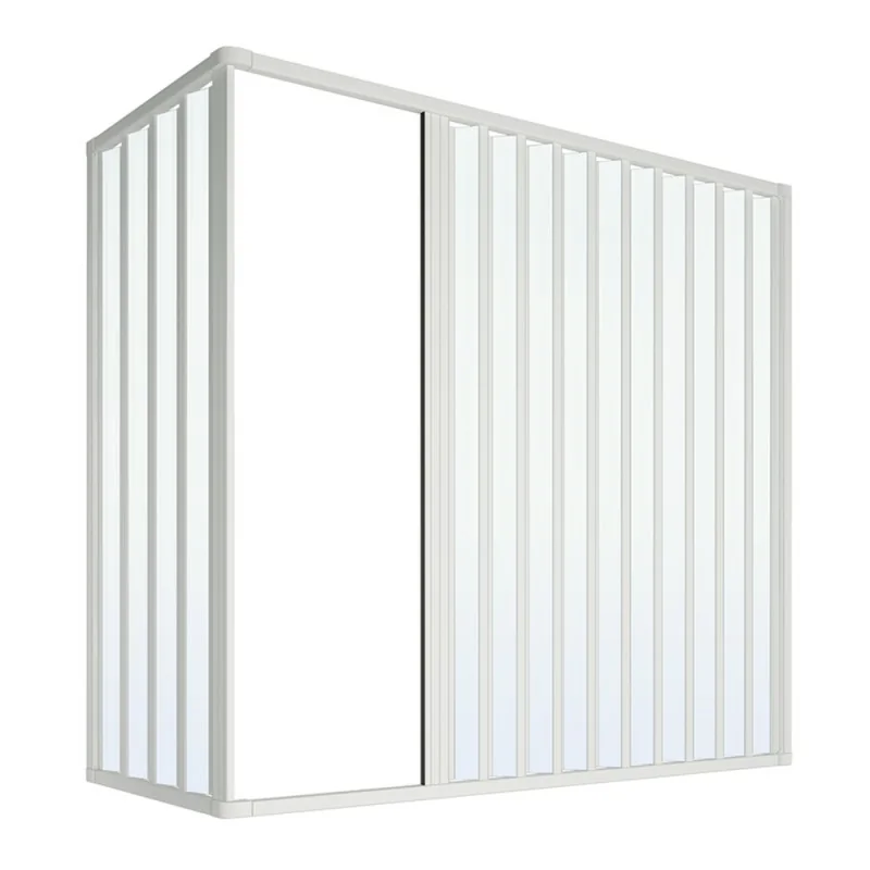 Il Box doccia angolare della Linea Teti, con pannelli semitrasparenti e profili bianchi, è realizzato in PVC e presenta due ante estensibili a soffietto con apertura centrale e chiusura calamitata a tutta altezza. I pannelli, con maniglia integrata nel profilo della porta, si raggruppano sui due lati del box garantendo un ampio spazio d’entrata. La cabina doccia Teti è la soluzione ideale per piatti doccia incassati tra due pareti ad angolo.