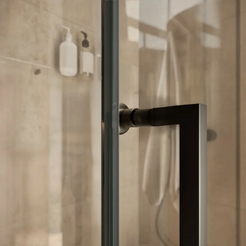 Il box doccia angolare Nylo, in elegante configurazione 90x70 cm, unisce la praticità di una porta a battente a un lato fisso per un accesso agevole e un design di forte impatto. La struttura minimalista è esaltata dal contrasto tra il cristallo temperato trasparente da 6 mm e i moderni profili in finitura nero opaco. Con un'altezza di 200 cm, garantisce un'estetica slanciata e contemporanea, perfettamente in linea con le tendenze attuali. Un elemento d'arredo che coniuga sicurezza, data dalla robustezza del vetro, e stile, creando un punto focale sofisticato nella stanza da bagno. L'installazione è reversibile, permettendo la massima adattabilità.
