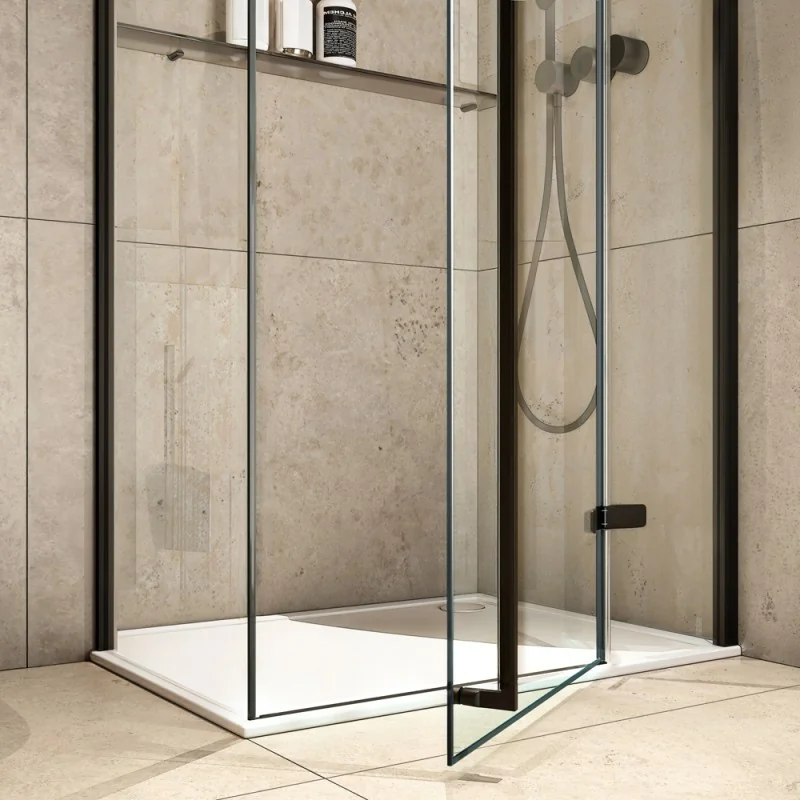 Box doccia angolare Nylo, moderno ed essenziale, con dimensioni 80x100 cm, ideale per bagni che necessitano di un tocco di design contemporaneo. La composizione prevede una porta a battente abbinata a una parete fissa, garantendo un'apertura comoda e un'ottima fruibilità dello spazio doccia. Realizzato con robusto cristallo temperato trasparente da 6 mm, il box si distingue per l'altezza di 200 cm e i raffinati profili in finitura nero opaco, che creano un contrasto elegante e di tendenza. La struttura è versatile grazie all'installazione reversibile, adattandosi con facilità a diverse configurazioni del piatto doccia. Unisce qualità dei materiali e stile minimale per un ambiente bagno ricercato.