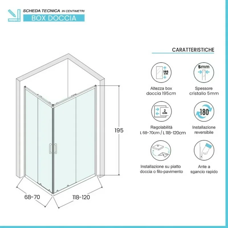 Box doccia angolare 70x120 – caratteristiche tecniche:
