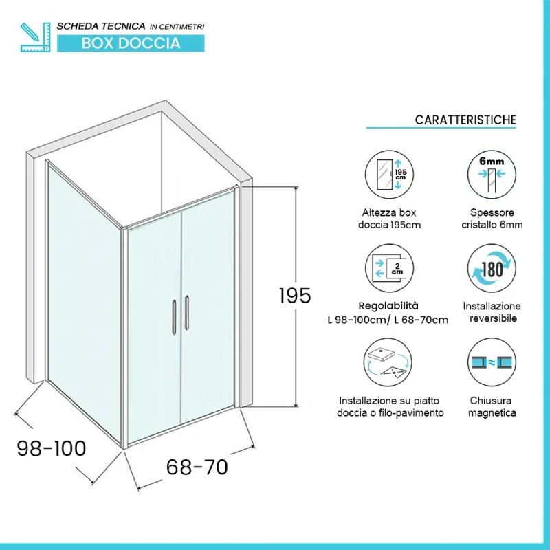 La Linea Neos offre box doccia pensati per adattarsi a ogni stile e spazio, disponibili in varie misure e aperture. La cabina doccia angolare 100x70 con porta saloon e lato fisso in vetro temperato trasparente da 6 mm è la soluzione ideale per chi vuole un’apertura pratica e scenografica, comoda da utilizzare ogni giorno. I profili in alluminio nero opaco donano carattere e modernità all’ambiente, creando un contrasto elegante con la trasparenza del vetro. La chiusura magnetica assicura stabilità e protezione dagli schizzi, mentre l’installazione reversibile permette di adattare la cabina alle esigenze del tuo bagno.