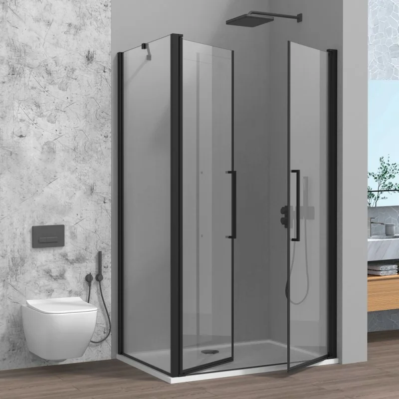 La Linea Neos offre box doccia pensati per adattarsi a ogni stile e spazio, disponibili in varie misure e aperture. La cabina doccia angolare 80x90 con porta saloon e lato fisso in vetro temperato trasparente da 6 mm è la soluzione ideale per chi vuole un’apertura pratica e scenografica, comoda da utilizzare ogni giorno. I profili in alluminio nero opaco donano carattere e modernità all’ambiente, creando un contrasto elegante con la trasparenza del vetro. La chiusura magnetica assicura stabilità e protezione dagli schizzi, mentre l’installazione reversibile permette di adattare la cabina alle esigenze del tuo bagno.