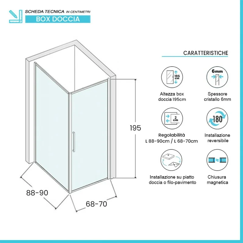Box doccia angolare 90x70 – caratteristiche tecniche: