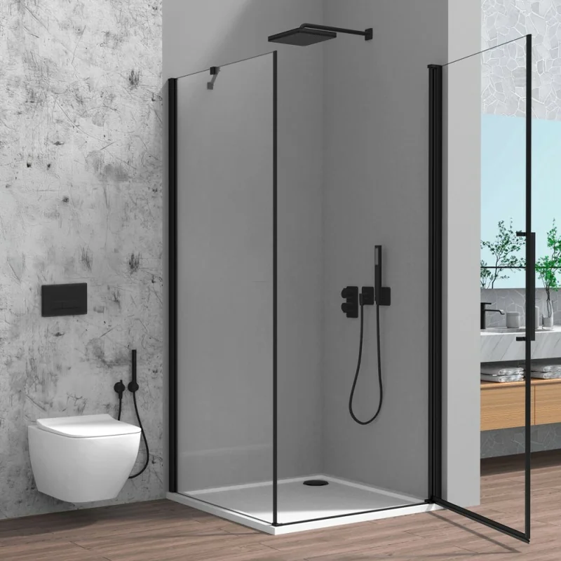 Cabina doccia angolare con porta battente e lato fisso in vetro temperato trasparente 90x70 profili nero opaco Linea Neos