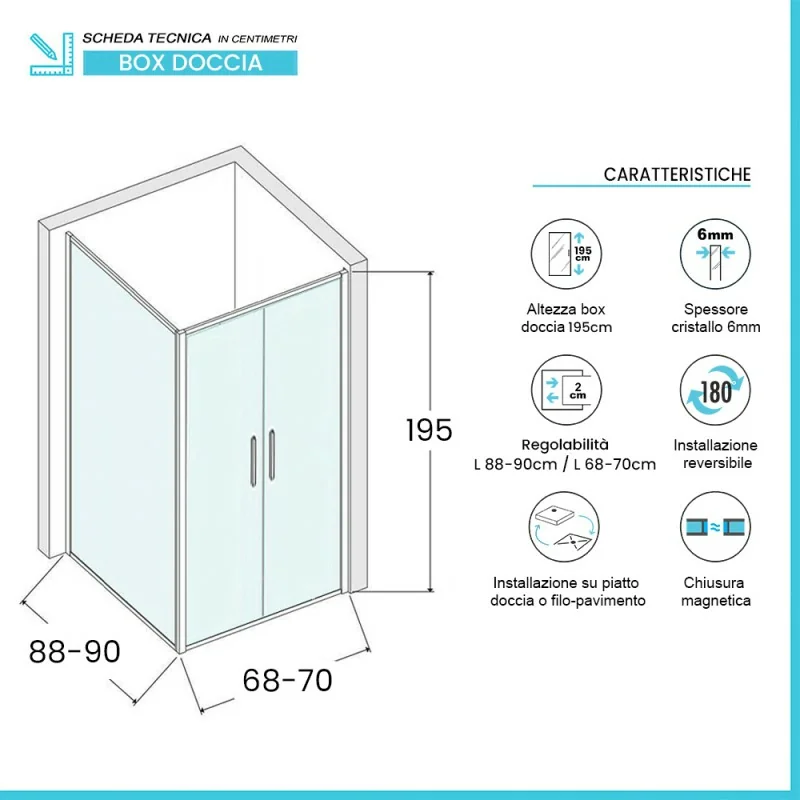 • Tipologia: box doccia angolare con apertura saloon;