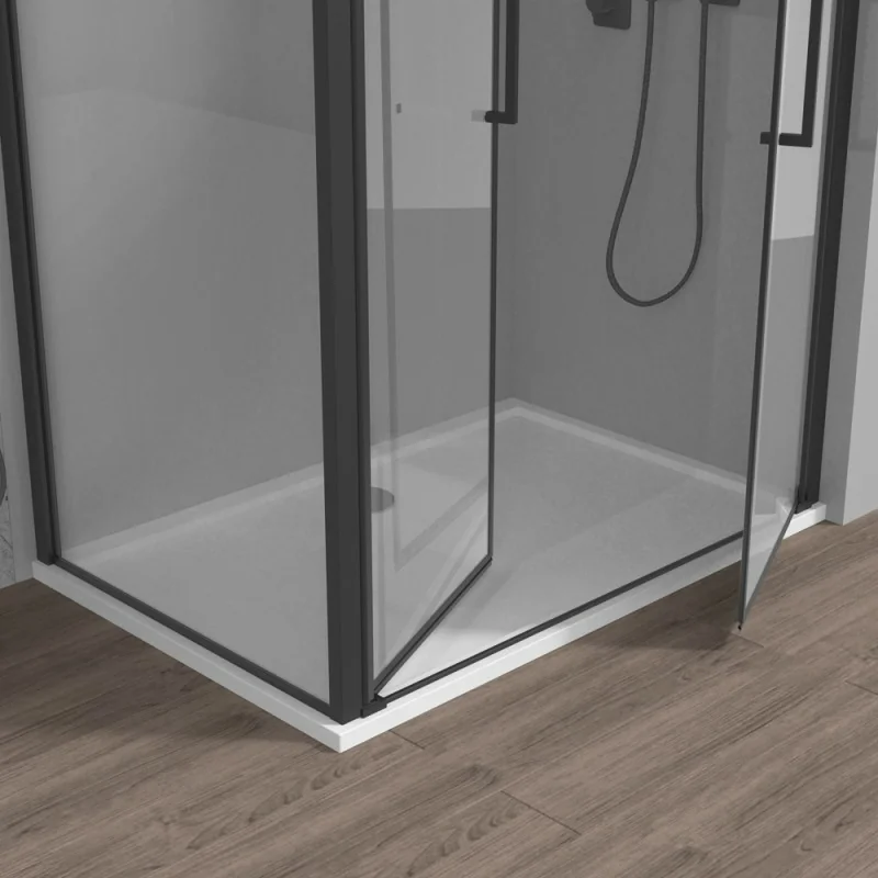 La Linea Neos offre box doccia pensati per adattarsi a ogni stile e spazio, disponibili in varie misure e aperture. La cabina doccia angolare 90x70 con porta saloon e lato fisso in vetro temperato trasparente da 6 mm è la soluzione ideale per chi vuole un’apertura pratica e scenografica, comoda da utilizzare ogni giorno. I profili in alluminio nero opaco donano carattere e modernità all’ambiente, creando un contrasto elegante con la trasparenza del vetro. La chiusura magnetica assicura stabilità e protezione dagli schizzi, mentre l’installazione reversibile permette di adattare la cabina alle esigenze del tuo bagno.