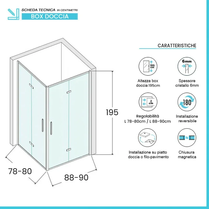 • Tipologia: box doccia angolare con doppia porta a soffietto;
