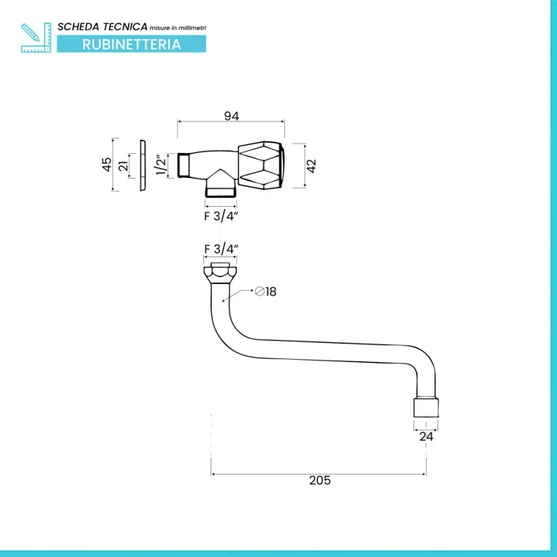 Rubinetto a muro con canna lunga orientabile in ottone cromo Scheda tecnica Rubinetto a muro con canna lunga orientabile in ottone cromo