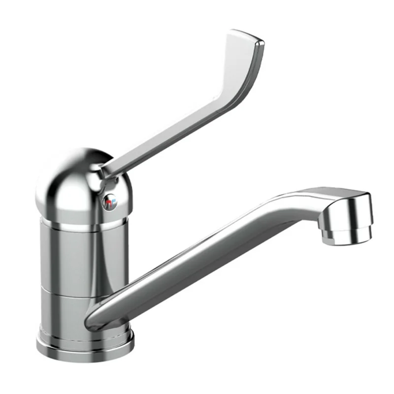 Il miscelatore lavello Ten Tiemme unisce l'eleganza di un design raffinato alla funzionalità superiore, offrendo la soluzione ideale per qualsiasi ambiente in cui l'igiene è prioritaria. La sua leva clinica, lunga ed ergonomica, permette di regolare il flusso e la temperatura dell'acqua con l'uso del gomito o dell'avambraccio, riducendo al minimo il contatto delle mani con la superficie.