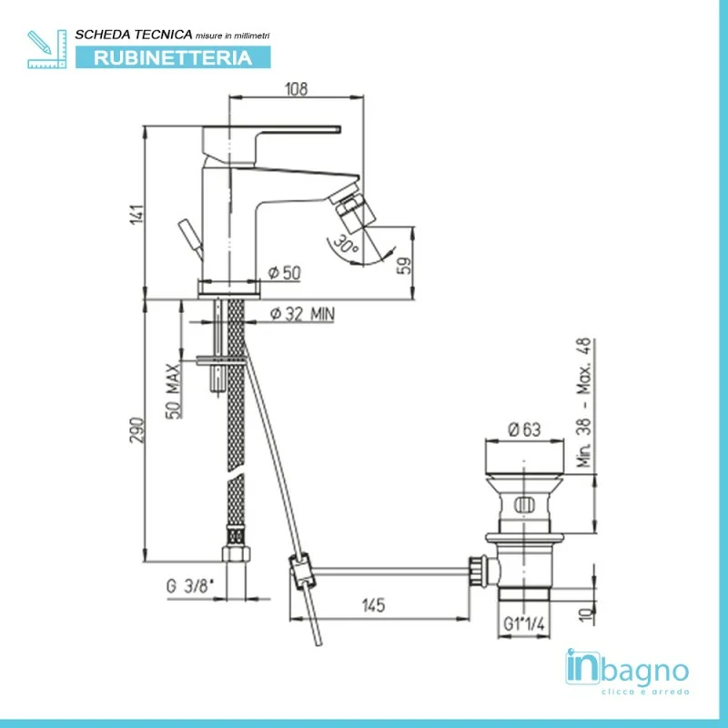 Miscelatore Bidet Piralla Baci 0CI00094A16 in ottone Cromato Completo di Piletta Scheda Tecnica Miscelatore Bidet Piralla Baci 0CI00094A16