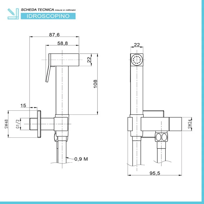 Idroscopino quadrato in ottone cromato con tubo flessibile silver Scheda tecnica idroscopino quadrato in ottone cromato con tubo flessibile silver Doccetta igienica quadrata in ottone cromato con tubo flessibile in pvc, supporto doccia e rubinetto d'arresto
