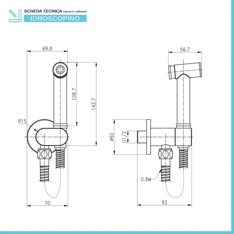 L’idroscopino ha forma tonda,progettato in ottone con finitura nero opaco che lo rende elegante e moderno. L’idrogetto è dotato di flessibile lungo 90 cm,ideale per raggiungere anche le zone più difficili,e doccetta igienica con supporto e sistema di anti-allagamento con semplice arresto.