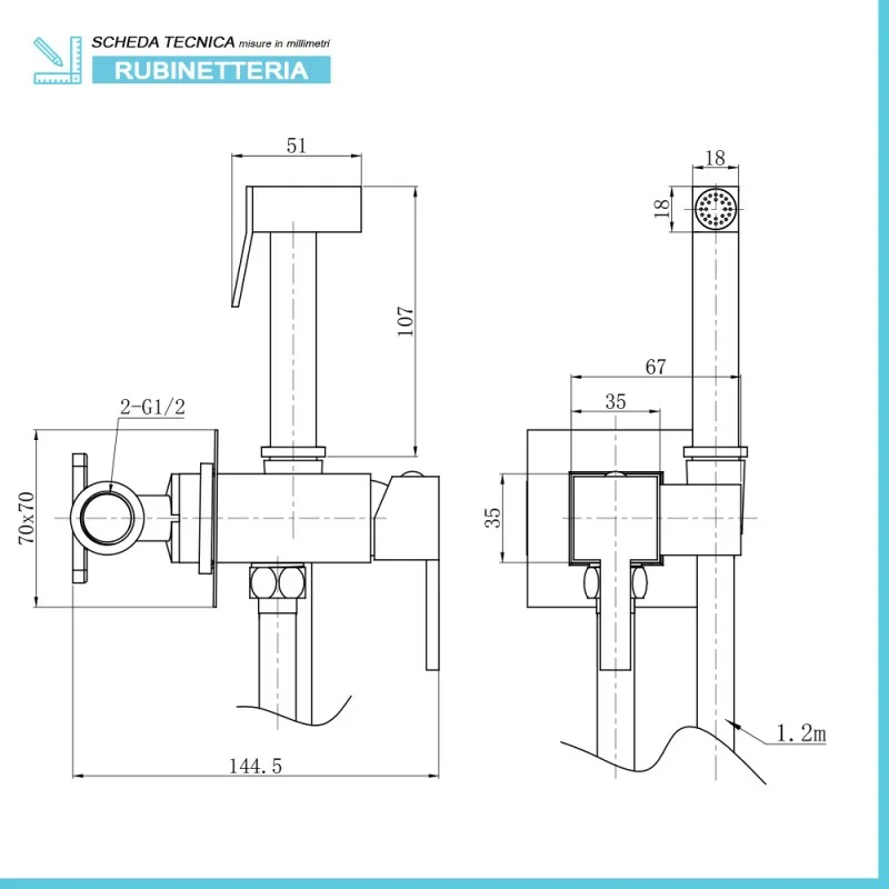 Idroscopino per wc e bidet cromo quadro con miscelatore e flex 120 cm Scheda tecnica Idrogetto per wc e bidet cromo quadro con miscelatore e flex 120 cm