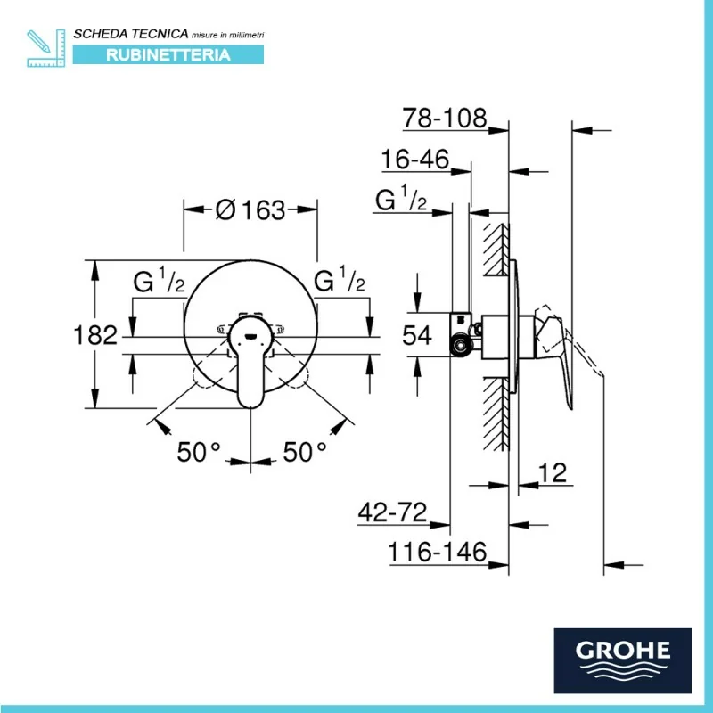Miscelatore doccia incasso grohe bauedge ottone cromo completo di corpo incasso