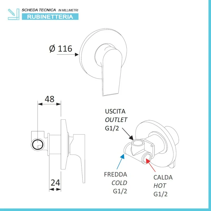 Il miscelatore doccia incasso è realizzato in ottone di alta qualità,resistente alla corrosione e destinato a durare nel tempo. È dotato di innovativa cartuccia a dischi ceramici e completo di corpo a incasso.