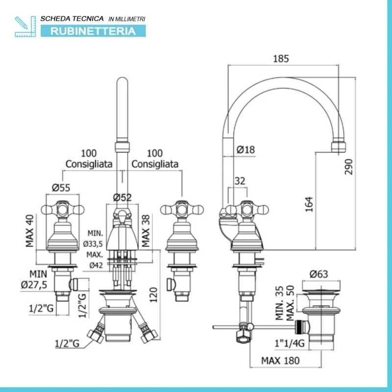La batteria lavabo proposta è realizzata in ottone di alta qualità,con finitura cromato lucido in grado di conferire un tocco di lucentezza all’intera sala da bagno;è a tre fori con canna alta orientabile secondo le proprie preferenze e manopole di azionamento.