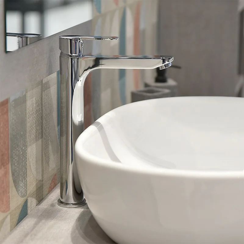 Il rubinetto lavabo alto è realizzato in ottone con finitura cromato lucido,completo di sistema di scarico click clack;disponibile in set con miscelatore bidet.