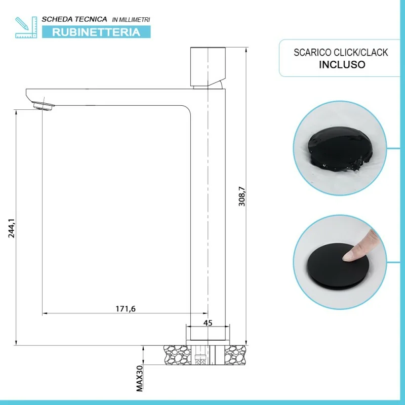 Miscelatore lavabo alto in ottone nero opaco con piletta inclusa Lotus Scheda tecnica Miscelatore lavabo alto in ottone nero opaco con piletta inclusa Lotus